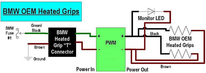 When you take the box apart you'll find that the potentiometer under the knob is separate from the PWM printed circuit board. What I did was lengthen those wires so that I could install the potentiometer and knob in the dash pad and hid the rest of it in the fairing. I also coated the potentiometer in five minute epoxy to waterproof it. I installed a 3mm 12V LED, wired to the output, right above the control knob for visual verification that the heated grips are getting power and to make it easier to find the knob at night. BMW OEM Heated Grips: The factory main wiring harness for K bikes has a connector for heated grips. It is a "T" connector which has short leads and can be found under the tank on the left side about two thirds of the way back. It has two wires. The green/black wire is switched power from Fuse 1. The brown wire is a ground. Use the green/black wire as the positive input and the black wires from the old white connector as the positive output to the heated grips.