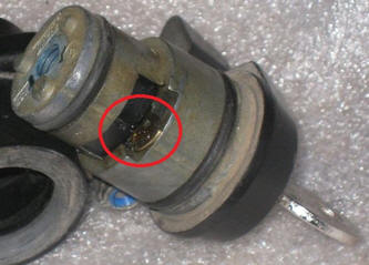 Once the 4V ignition switch is removed from the upper fork tree, stick a pin or whatever into the small hole shown below and wiggle the key to remove the lock core.
