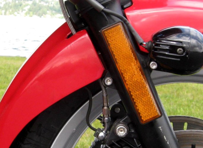 Fork Mounted 70W Orange Auxiliary Lights: This bike has very orange and very obvious 70W fog lights mounted on the forks. They are cleanly and simply mounted using stainless steel bolts and spacers on the front fork reflectors. They are fork mounted to create a triangle with the headlight. This makes it much easier for drivers of other vehicles to judge your speed and distance. For motorcycle conspicuity, these are the best lights I've seen and I mount them on all of my bikes. The radically and noticeably reduce the number of cars that don't see you. They also do a good job of frilling in under the high beam at night and make great fog lights as well. They are controlled by a 3-way BMW switch in the handlebar dash pad so that you can run them with the high beam at night or the low beam during the day.